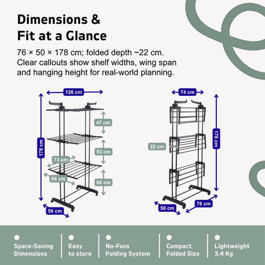 Straame 4-Tier Winged Clothes Airer – Foldable Clothes Drying Rack with Wheels for Indoor/Outdoor Use, Heavy-Duty Laundry Airer, Dryer rack, 76×50×178 cm (Black)