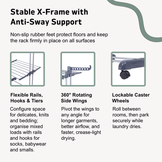 Straame 4-Tier Winged Clothes Airer – Foldable Clothes Drying Rack with Wheels for Indoor/Outdoor Use, Heavy-Duty Laundry Airer, Dryer rack, 76×50×178 cm (Grey)